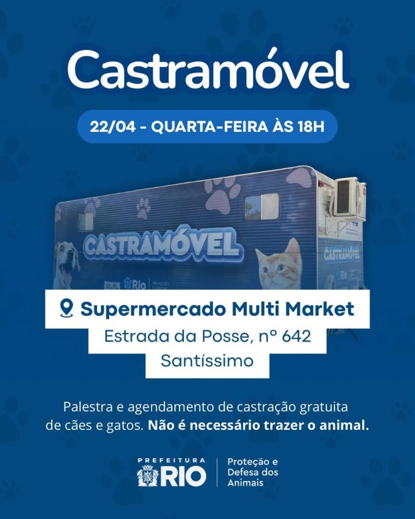 Nesta quarta-feira (22), às 18h, um evento de orientação sobre esterilização de cães e gatos será realizado na unidade móvel do Castramóvel, estacionada no Supermercado Multi Market, em Santíssimo, na Zona Oeste do Rio de Janeiro.