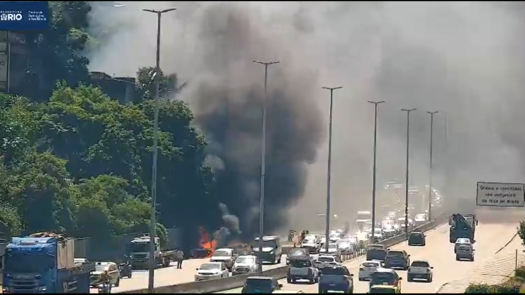 Incêndio em veículo provoca interdição parcial na Linha Amarela, no Rio de Janeiro