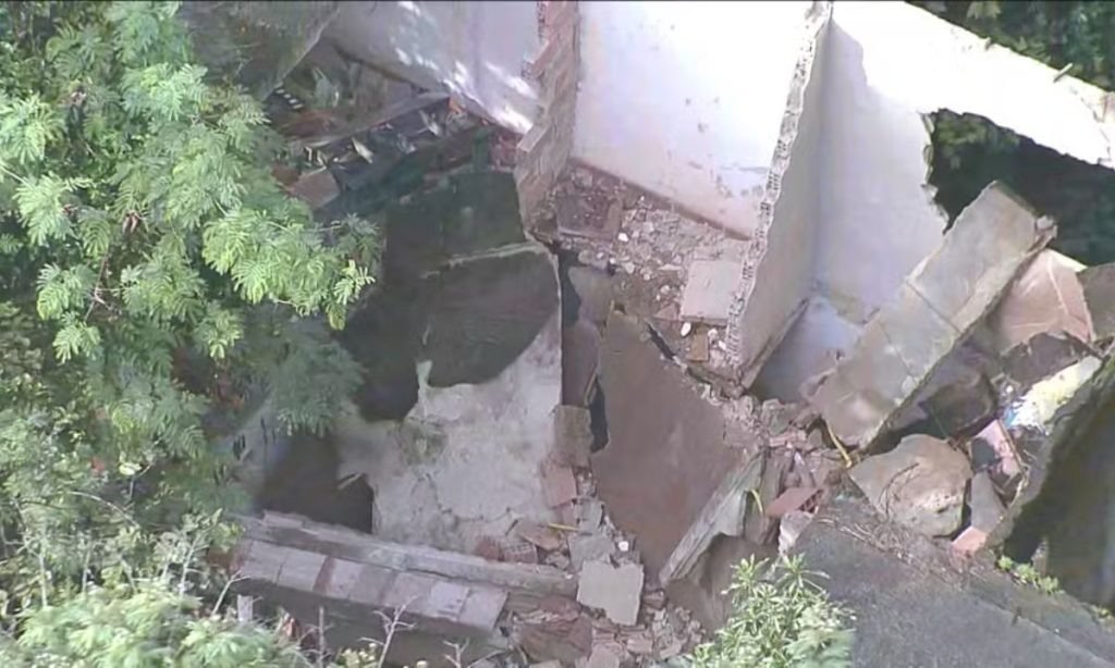 O desabamento ocorreu na manhã desta sexta-feira (6) no bairro Novo México, em São Gonçalo, e deixou uma mulher de 62 anos soterrada. A vítima foi resgatada com vida pelo Corpo de Bombeiros, com apoio de moradores e equipes de salvamento. Foto: Reprodução/TV Globo