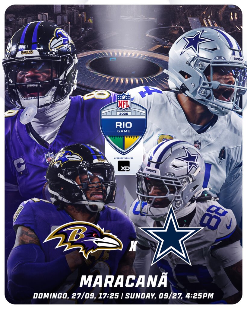 A NFL anunciou que o Baltimore Ravens será o adversário do Dallas Cowboys na partida que marcará a primeira edição do NFL Rio Game, prevista para 2026. A confirmação foi feita em evento realizado durante o segundo dia do NFL Draft, na cidade de Pittsburgh, nos Estados Unidos.
