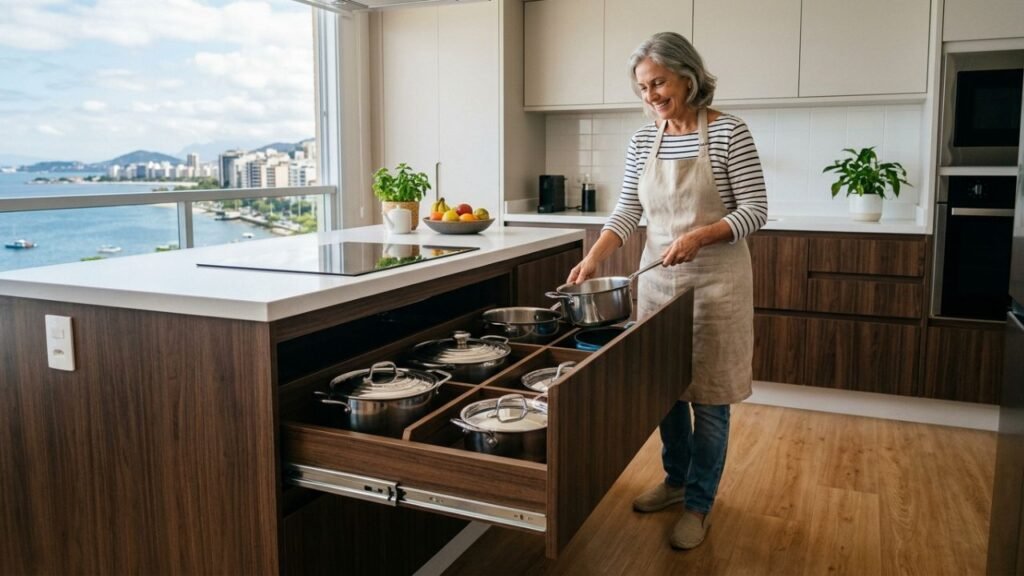 A utilização de mecanismos telescópicos em armários de cozinha possibilita que panelas e utensílios volumosos sejam acessados com maior facilidade, sem exigir que moradores se inclinem ou se abaixem. Essa adaptação contribui para a preservação da saúde da coluna, especialmente em residências na cidade.